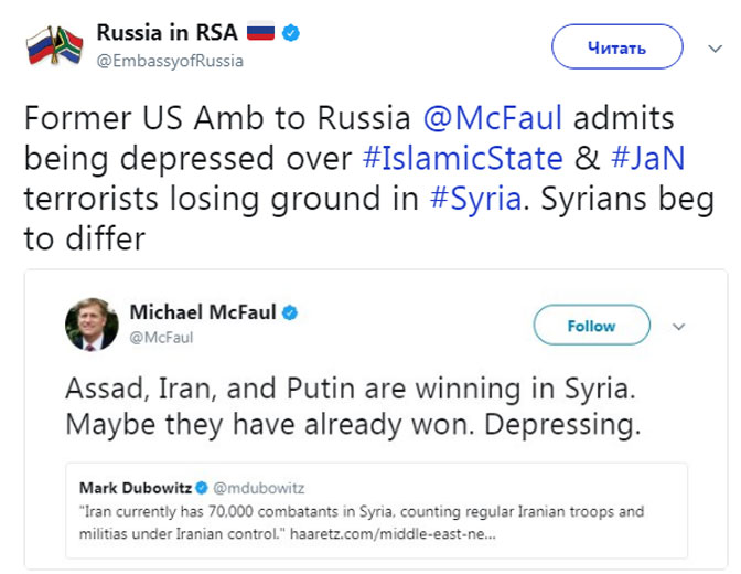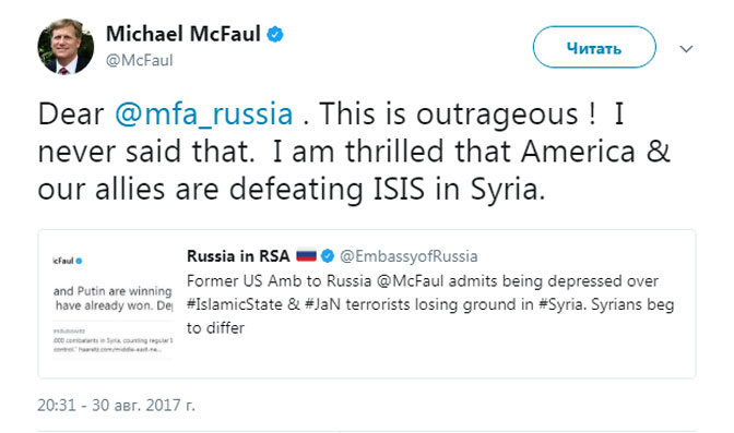 Данное заявление Макфола вызвало резкую критику со стороны пользователей Сети, которые обвинили США в открытой поддержке террористов, а на твит посла обратили внимание даже в посольстве России в ЮАР.