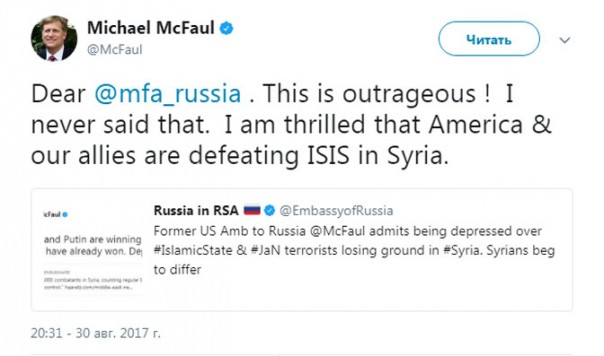 Майкл Макфол подавлен тем, что боевики террористической группировки «Исламское государство» (запрещена в РФ) теряют свои позиции в Сирии.