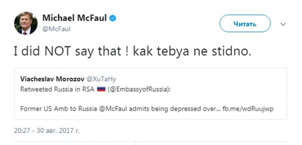«Я не говорил этого, как тебе не стыдно», - написал Макфол одному в ответ одному из пользователей.