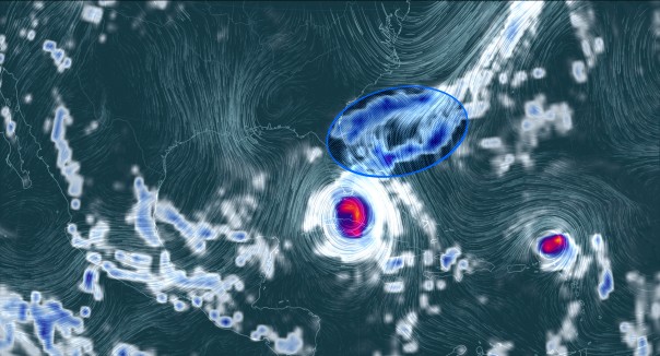 Но, несмотря на это, сама опасность Ирмы уменьшится не существенно, так как, пройдя через Флориду, Ирма захватит в сферу своего влияния воздушно-водяные массы, скопившиеся над океаном чуть правее от побережья штатов Джорджия и Южная Каролина. Эти области перенасыщенные водой отмечены на рисунке ниже овалом: