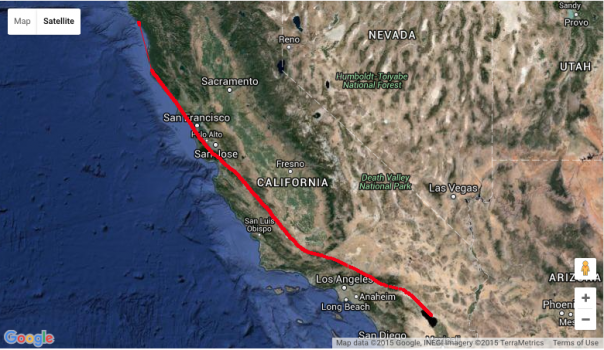 В течении последних двух часов наблюдается серия мелких (2.2-2.5) толчков по всему Разлому Сан - Андреас.
