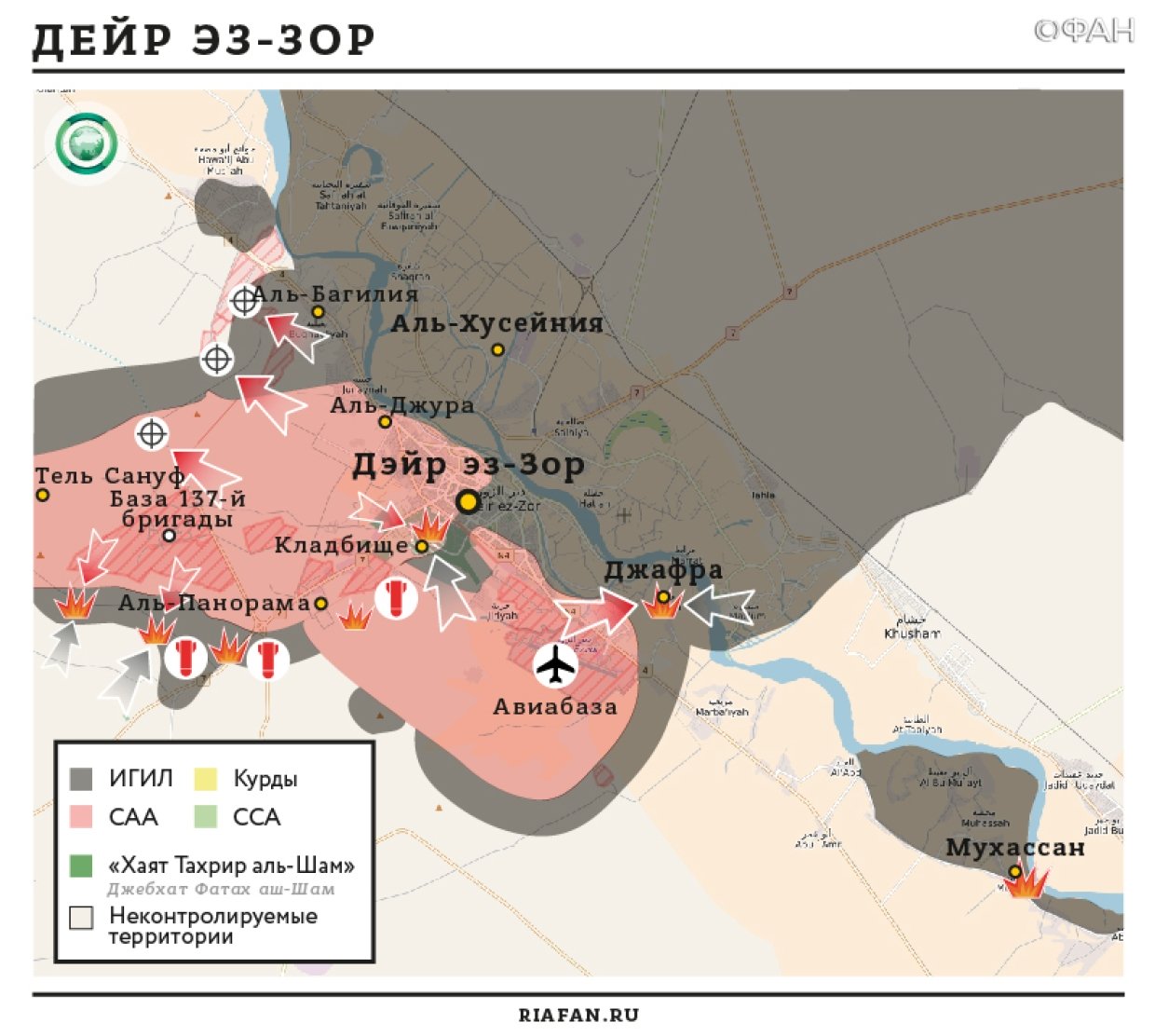 Между тем, отряды сирийского армейского спецназа Силы тигра и их союзники начали штурм позиций ИГИЛ на территории города Дейр-эз-Зор и подготовку к возможной операции по форсированию реки Евфрат.