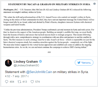Линдси Грэм вместе с Джоном Маккейном приветствовали ракетный удар США по сирийской авиабазе Шайрат 7 апреля.