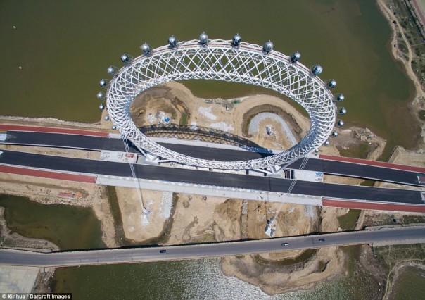 Футуристическое сооружение разместили на 540-метровом мосту через реку Байлaнг в городе Вэйфан на востоке Китая.