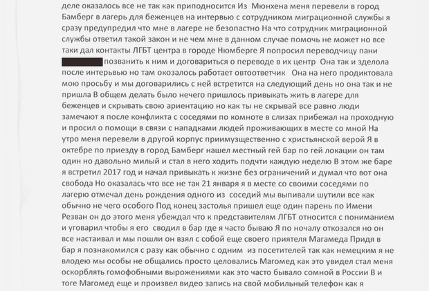 Я поначалу отказывался, но он все настаивал, и мы пошли. Он взял с собой еще одного своего приятеля Магомеда. Придя в бар, я познакомился сразу как обычно с одним из посетителей. Так как немецким я не владею, мы особо не общались, просто целовались. Магомед, как это увидел, стал меня оскорблять гомофобными выражениями, как это часто бывало со мной в России. В итоге Магомед еще и произвел видеозапись на свой мобильный телефон, как я целовался с мужчиной. Под конец всего они вместе с Ризваном начали меня избивать: вернее, Ризван меня ударил только по спине, а Магомед наносил остальные побои сам. Сначала один раз по лицу, потом в область туловища, при этом нецензурно оскорбляя.
