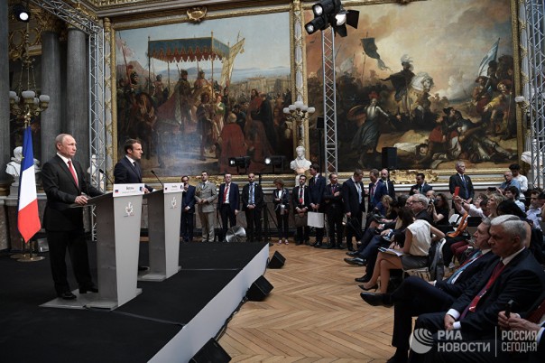 Владимир Путин и Эммануэль Макрон во время совместной пресс-конференции по итогам российско-французских переговоров в Версальском дворце. 29 мая 2017