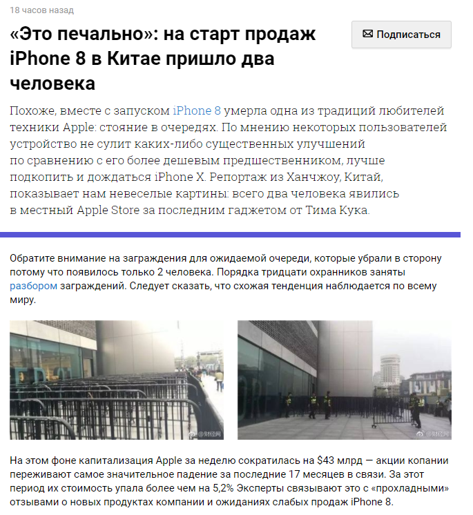 Но в любом случае отсутствие очередей на старте продаж iPhone 8 должно настораживать. Экономика потреблядства все-же подходит к своему логическому концу… Источник