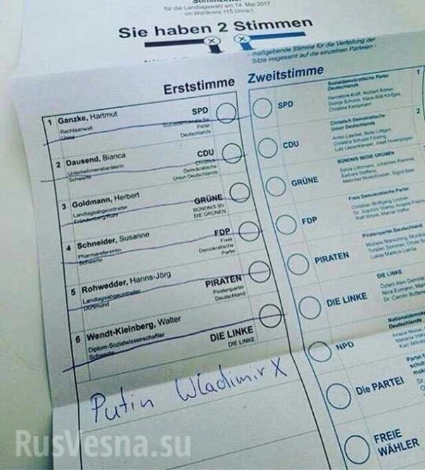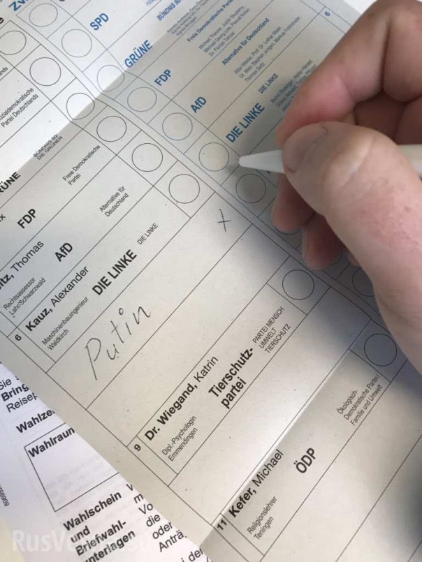 Кроме того, пользователи соцсетей публикуют фото бюллетеней, на которых немцы пишут имя Владимира Путина и ставят напротив него крестик. Судя по всему, таким образом граждане выражают свой протест против политики действующей власти.