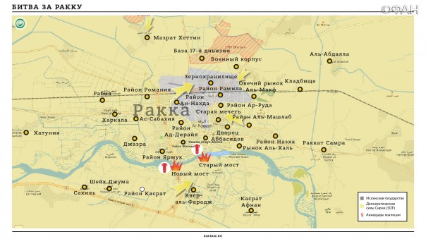 В центральной части города Ракка продолжились бои между СДС и ИГИЛ. Кроме того, ИГИЛ провело вылазку на позиции СДС в районах Ас-Синаа и Аль-Машлеб.