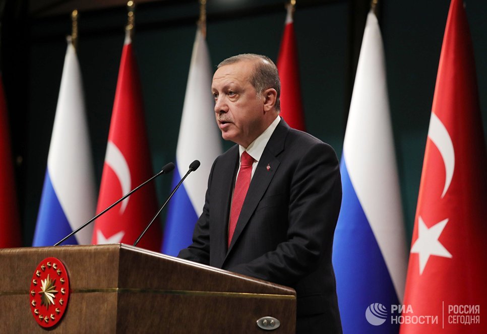 Президент Турции Реджеп Тайип Эрдоган на пресс-конференции по итогам переговоров с президентом РФ Владимиром Путиным в президентском дворце в Анкаре. 28 сентября 2017