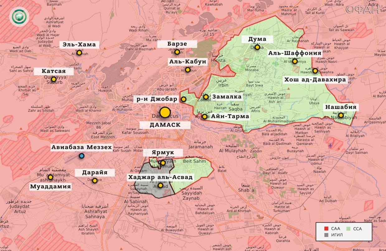 Сирийская арабская армия (САА) и союзные силы: ведут ракетный обстрел позиций боевиков в районах Джобар и Айн-Тарма на северо-востоке Дамаска.