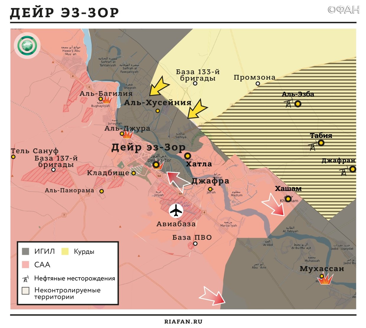 Между тем, правительственные силы во главе с сирийским армейским спецназом «Силы тигра» начали штурм оплота ИГИЛ – города Майядин. САА заняла территорию старого аэропорта, элеветора и другие позиции западнее и южнее города.