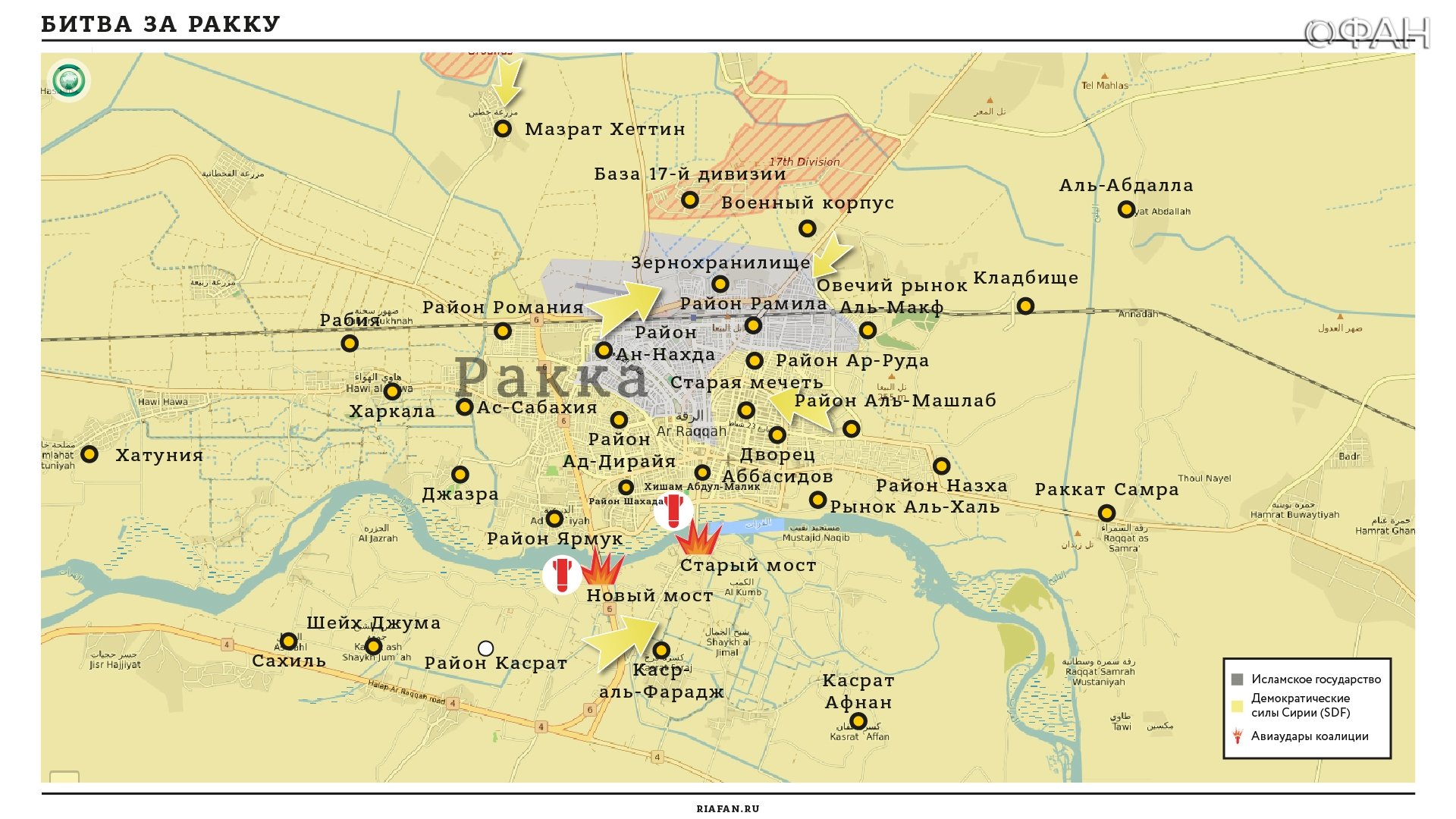 По сообщению Facebook-канала (wessamwh), Сирийские демократические силы (SDF) и США ведут переговоры с террористами «Исламского государства» в Ракке. Согласно сведениям источника, радикалам террористической группировки было предложено сдать свои позиции добровольно в обмен на беспрепятственную эвакуацию вместе со своими семьями. В настоящий момент переговоры все еще продолжаются. Ранее сообщалось о том, что группа боевиков из 20 человек вместе с членами семей сдалась курдским войскам.