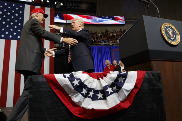 Президент США Дональд Трамп обнимает кандидата в американский сенат Лютера Стрейнджа на предвыборном митинге в штате Алабама. 22 сентября 2017