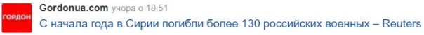 Украинцы пошли еще дальше и полностью переврали материал «Рейтерс», так у Gordonua новость вышла под заголовком: «С начала года в Сирии погибли более 130 российских военных — Reuters».