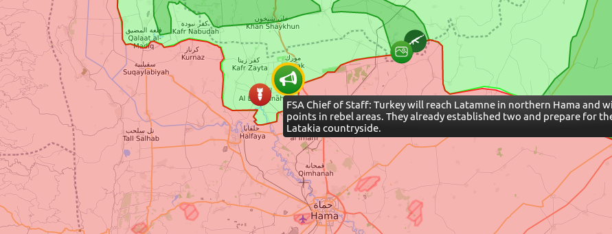 10.40. Согласно заявлению группировок FSA на севере провинции Хама, в планах турецкого командования — создание 11 опорных пунктов на территории провинций Идлиб/Алеппо, где базируются боевики «Свободой сирийской армии» FSA. Согласно их информации, Турция уже создала два таких «опорника», и готовится к организации третьего на севере провинции Хама. Напомним, ранее Турция ввела свой военный контингент на территории провинции Идлиб в рамках договоренностей по мониторингу за мирным процессом.