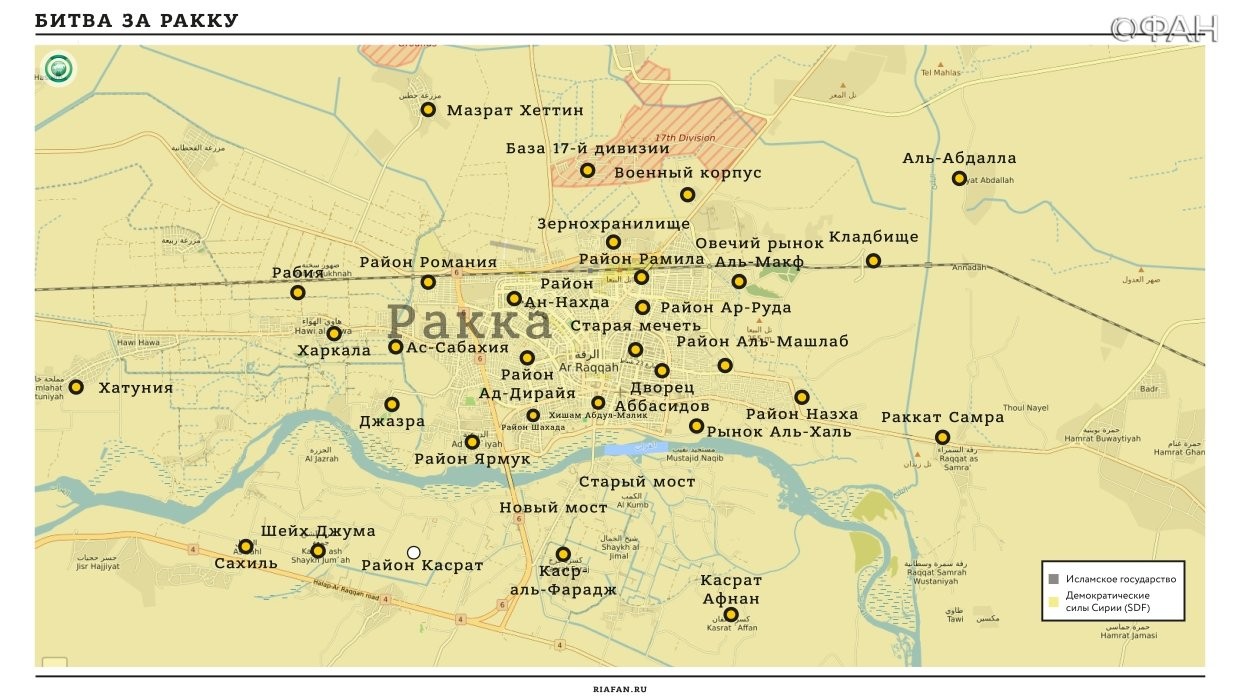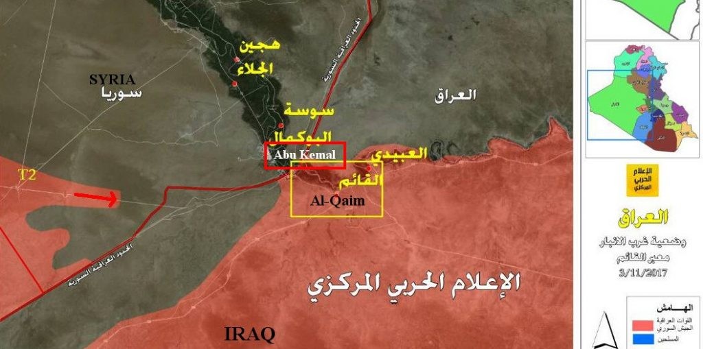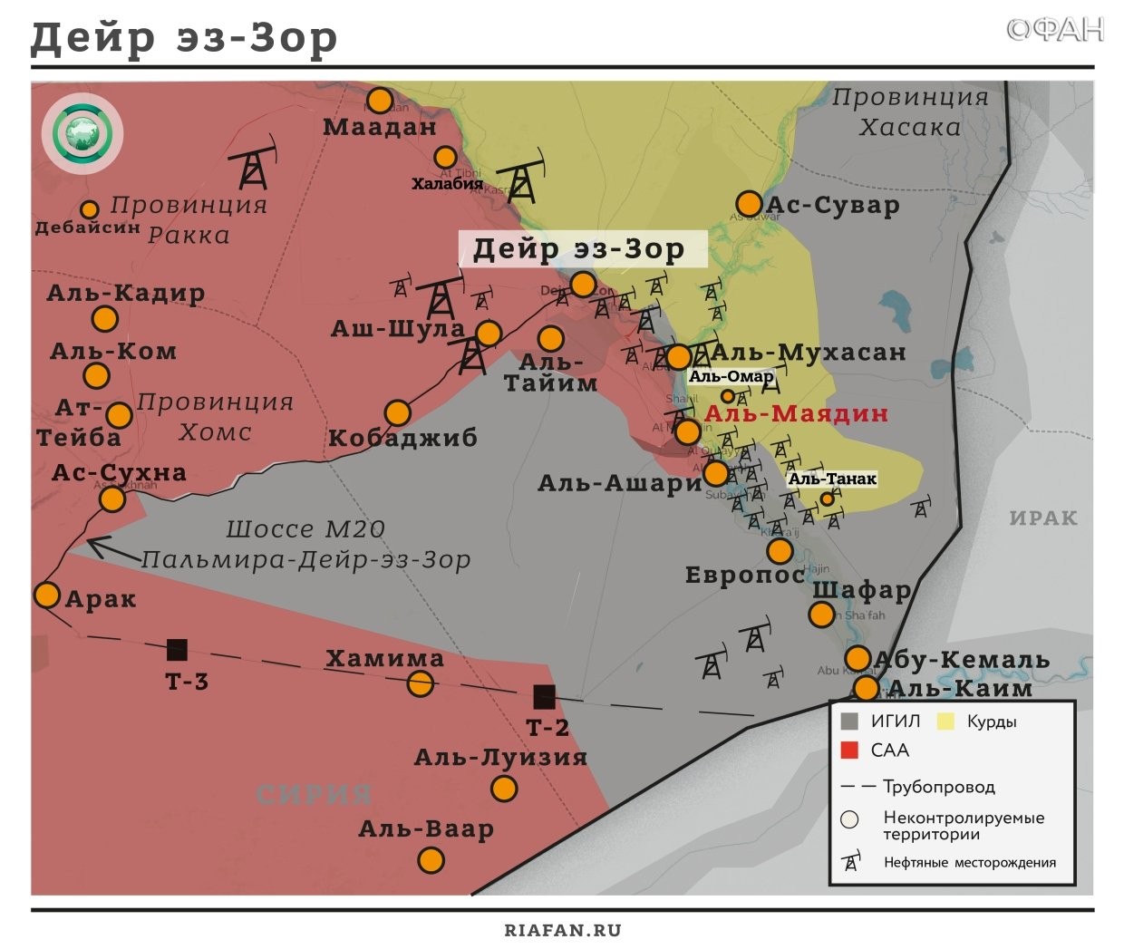 18.10. Правительственные силы продолжают двигаться к «последней крепости» ИГИЛ* — городу Абу Камаль близ границы с Ираком. Сирийская арабская армия и «Хезболла» идут по двум направлениям: вдоль западного берега Евфрата и с востока через пустыню от насосной станции Т-2. Как мы сообщали ранее, иракским федеральным войскам удалось взять под контроль пограничный переход аль-Кайм, затруднив таким образом отход боевиков ИГ*.