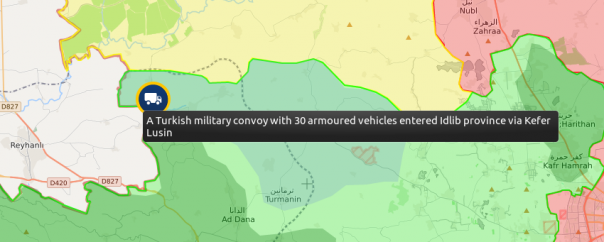 10.40. Очередной турецкий военный конвой зашел в провинцию Идлиб через пункт пропуска Атма. С места сообщают о 30 бронетранспортерах.