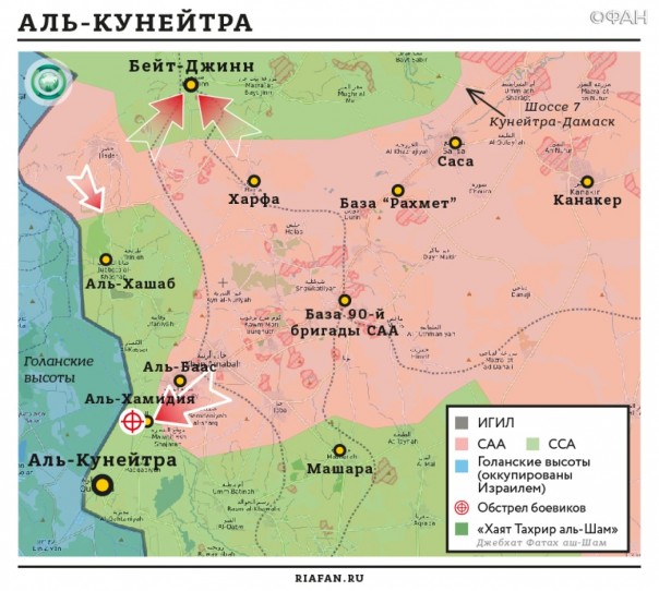 17.10. В конфликт в Хадере и аль-Кунейтра вмешался Израиль: авиация ЦАХАЛ обстреляла позиции боевиков FSA, которые все же смогли прорвать правительственную осаду Бейт Джинн. Как мы сообщали ранее, из этого районы сотни мирных друзов были вынуждены бежать на подконтрольные Израилю Голаны.