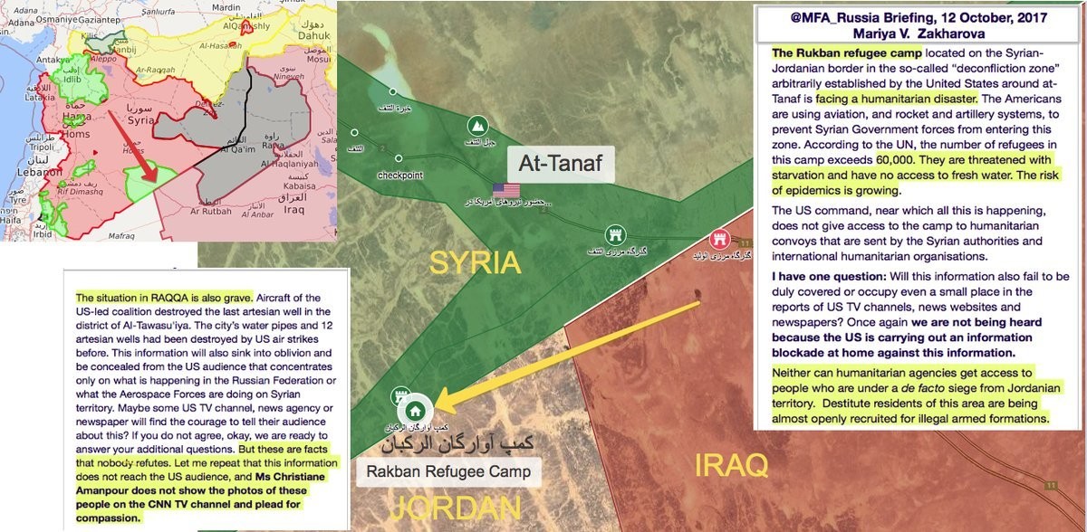 «Подобные действия военнослужащих США и так называемой международной коалиции в районе Эт-Танфа являются грубейшим нарушением международного гуманитарного права и могут быть квалифицированы как военное преступление», – отмечают в Центре. Ранее официальный представитель Министерства обороны России И. Конашенков говорил, что «сирийский лагерь беженцев «Рукбан» является «живым щитом» для базы США.