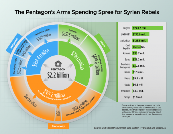 Foreign Policy пишет о переброске оружия советского образца отрядам СДС и другим группировкам, противостоящим Дамаску. По данным авторов доклада Центра исследования коррупции и организованной преступности (OCCRP) и Балканской сети журналистских расследований (BIRN), к маю 2017 года на автоматы Калашникова, противотанковые гранатомёты, миномёты и боеприпасы Пентагон потратил более 700 млн долл. К 2022 году планируется израсходовать ещё около 900 млн долл. и дополнительно 600 долл. заложены в бюджете.