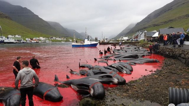 Эти снимки были сделаны на Фарерских островах волонтёрами из природоохранной организации Sea Shepherd Global. На фотографиях местные жители загоняют гринд и дельфинов на мелководье, где затем убивают их с помощью длинных ножей. Лезвие вонзают в шею животного, чтобы сломать ему спинной мозг, сообщает Metro.