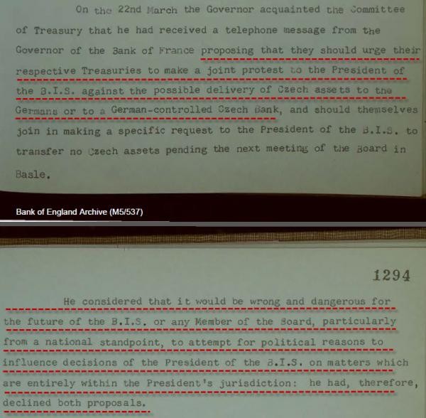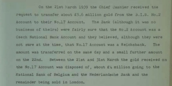 Речь идет о периоде после Мюнхенского сговора Англии и Франции с фашисткой Германией и начала нацистской оккупации Чехословакии в 1939 году. Британский регулятор реализовывал в то время золото от лица германского Рейхсбанка. Более 2 тысяч слитков были конфискованы фашистами у чехословацкого центробанка - их "переписали" с одного счета на другой. Физически большая часть драгметалла при этом находилась в Лондоне.