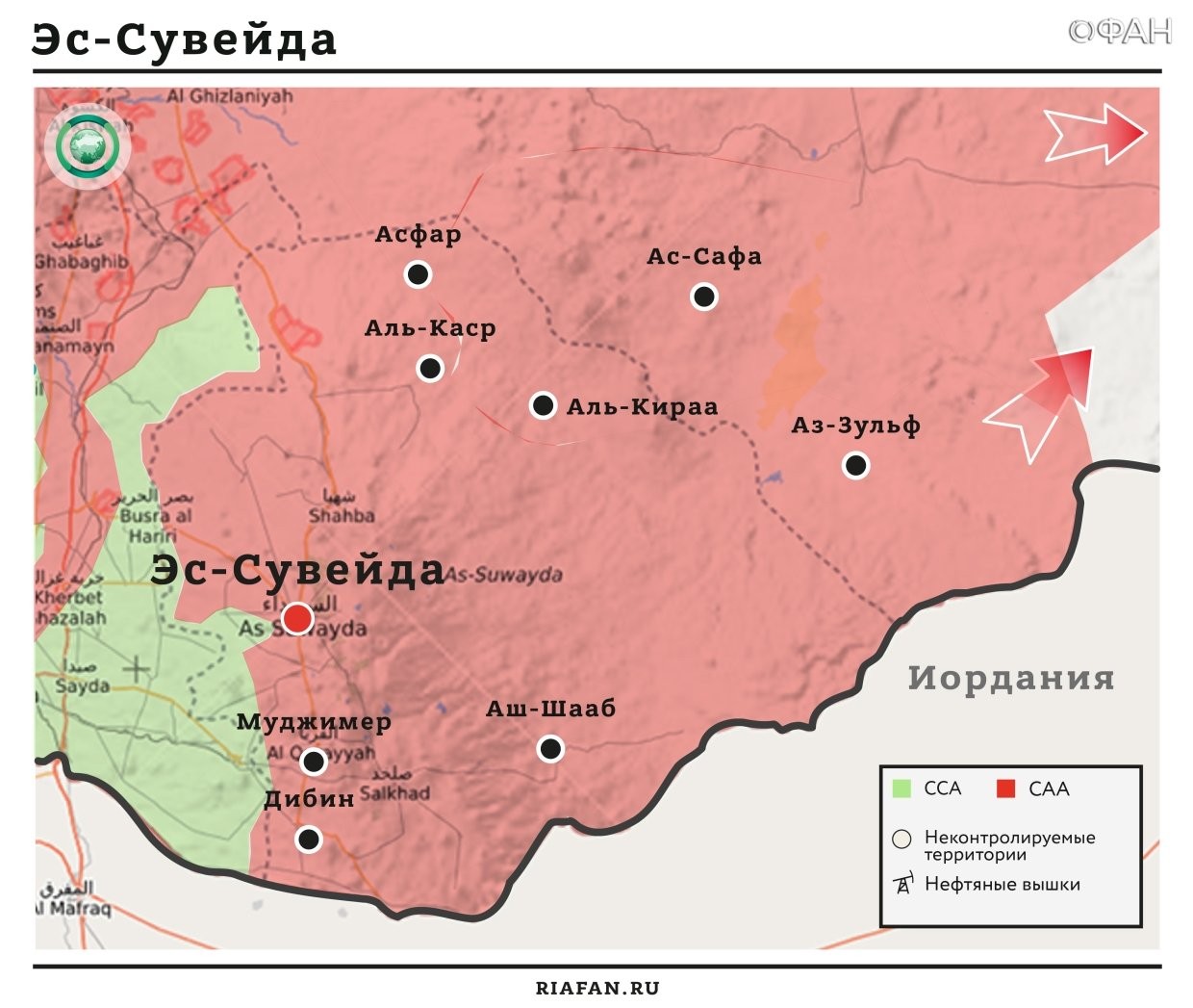 Сирийская арабская армия (САА) и союзные силы: задержали в Эс-Сувейде автомобиль боевиков с контрабандным оружием на пути в провинцию Дамаск; ожидают подкрепление в лице 150-200 бойцов NDF******, которые вскоре прибудут в Дейр-эз-Зор из Хасаки.