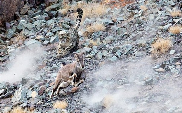 А однажды, после шестичасовой засады, фотографы сняли невероятно редкие кадры охоты барса на голубых баранов. Рассматривая фотографии, Ингер обнаружила, что они отлично иллюстрируют способность барсов маскироваться в горах. Один из таких снимков она выложила в Twitter с подписью «С ума сойти. Найдите барса».