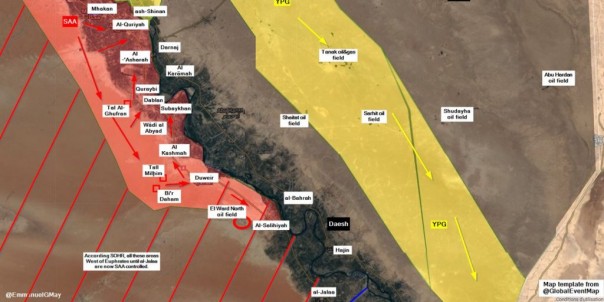 16.40. Нефтяное месторождение аль-Вард на западном берегу Евфрата находится под контролем правительственных сил, также Сирийская арабская армия контролирует аль-Салихия восточнее месторождения.