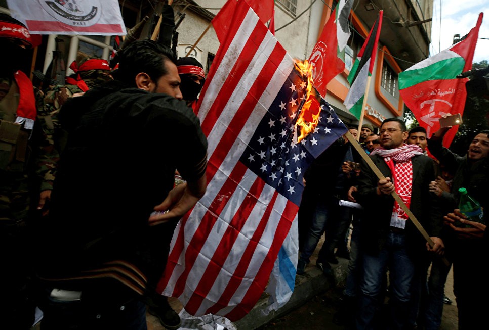 Палестинцы сжигают флаг США во время протеста против решения президента США Трампа признать Иерусалим столицей Израиля в городе Газа