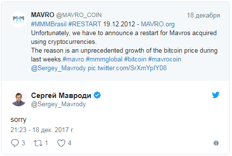 "Извините", — так прокомментировал новость о крахе проекта Мавроди. Также предприниматель сообщил, чтобы поклонники Mavro перестали покупать эту валюту и стали экстренно от неё избавляться. Mavro, стоившую на старте $1, предлагают "сливать" за $0,5.