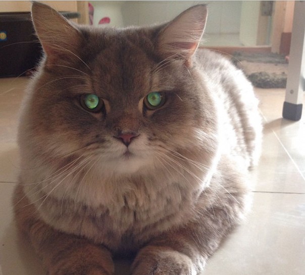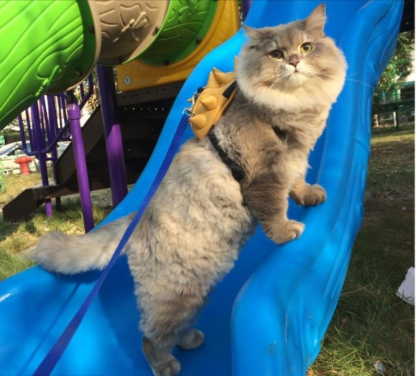 Его фишка — маленький желтый рюкзак на спине, по которому его можно узнать в толпе. Хотя, с его габаритами, легко выделиться в толпе других котов и без опознавательных знаков.