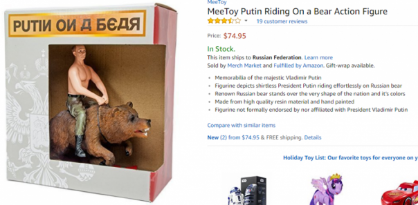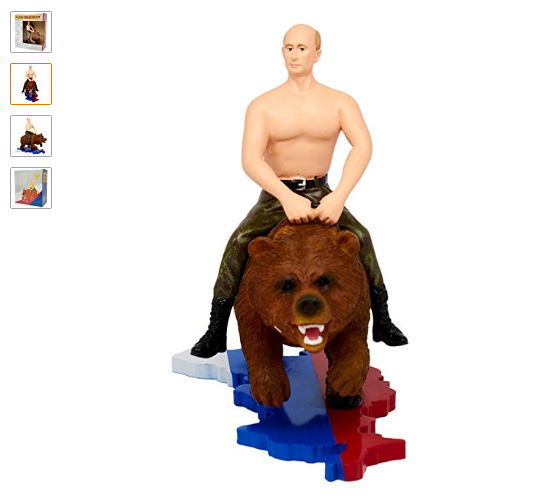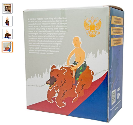 "Удивительно сексуальное изображение чуда без рубашки". Необычный товар появился в одном из крупнейших американских интернет-магазинов - фигурка Путина на медведе стоимостью в 75 долларов. В описании указано, что фигурка официально не одобрена и не связана с президентом России (по сути это то же самое, когда в начале видео на youtube блогер говорит, что все оскорбления - это оценочные суждения).