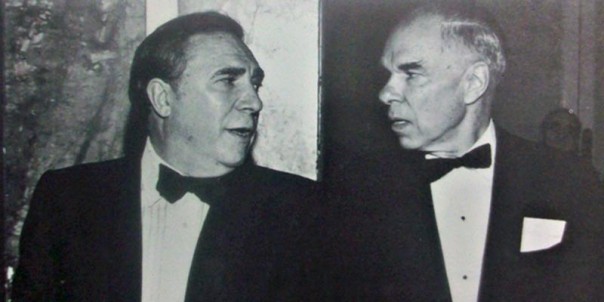 Файнберг (слева) за светской беседой с Нобелевским лауреатом по химии Гленном Сиборгом