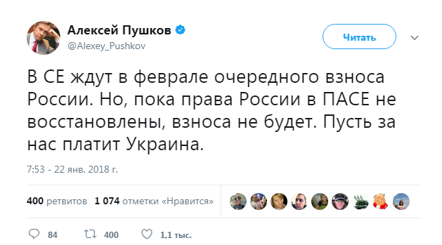 "В СЕ ждут в феврале очередного взноса России. Но пока права России в ПАСЕ не восстановлены, взноса не будет. Пусть за нас платит Украина", — написал он в Twitter.