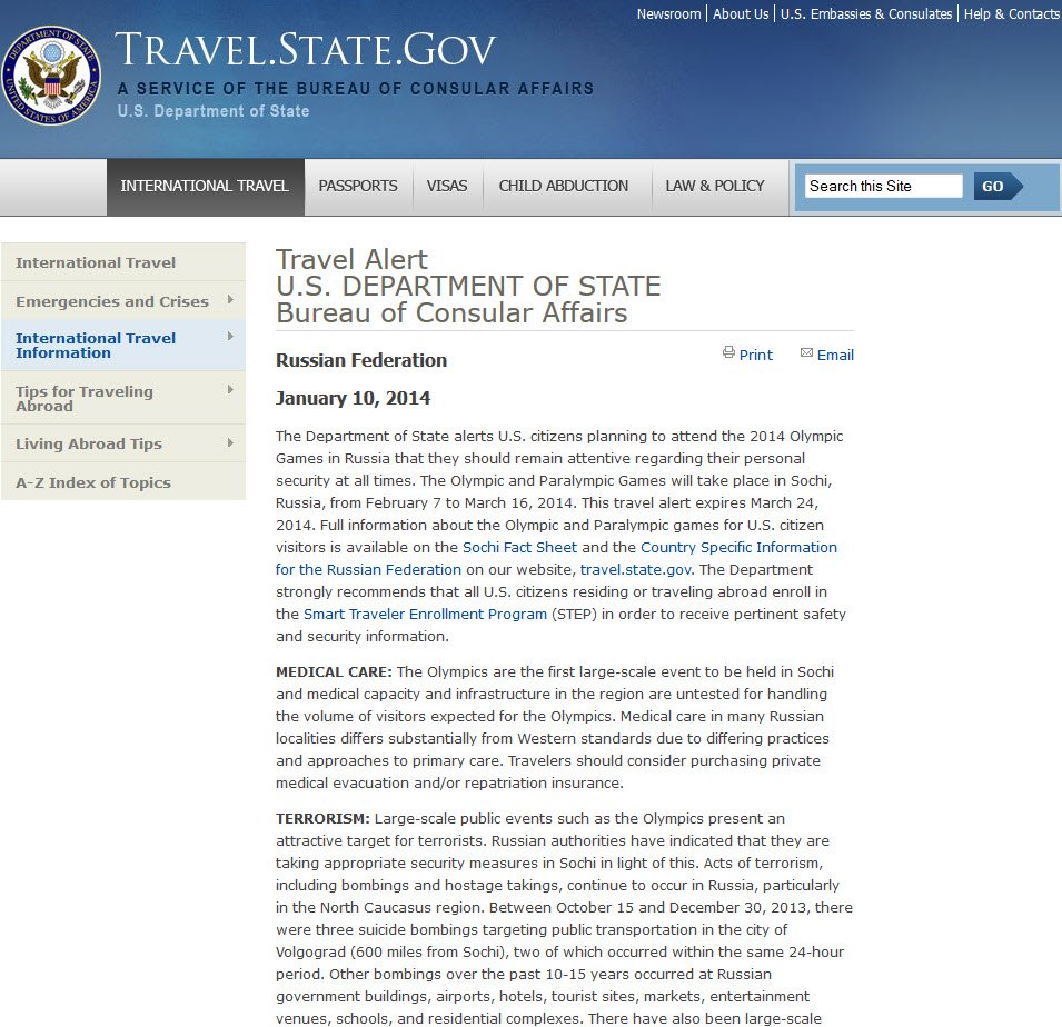 Госдеп США рассказал гражданам, собирающимся посетить Олимпиаду в Сочи, о трудностях и опасностях путешествия, выпустив специальную памятку. Особо выделена опасность терроризма, при этом Госдеп напомнил о высказываниях террориста Доку Умарова, грозившегося организовать теракты в ходе Игр. Также американцам рекомендуют избегать мест скопления людей, акций протеста, и помнить о запрете ЛГБТ-пропаганды.