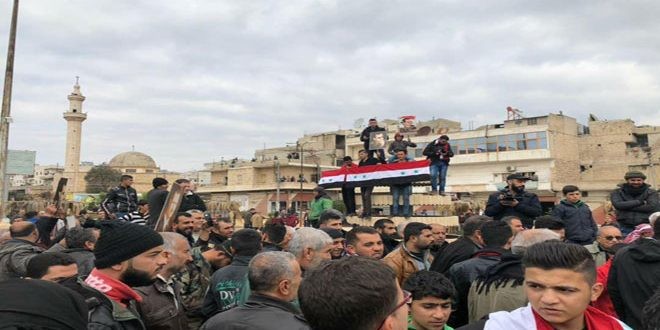Местные жители также подтвердили свою приверженность национальному единству Сирии, скандируя лозунги подтверждающие, что город Африн и его окрестности являются неотъемлемой частью сирийской территории, и что они не позволят наемникам и войскам Эрдогана осквернить сирийскую землю.