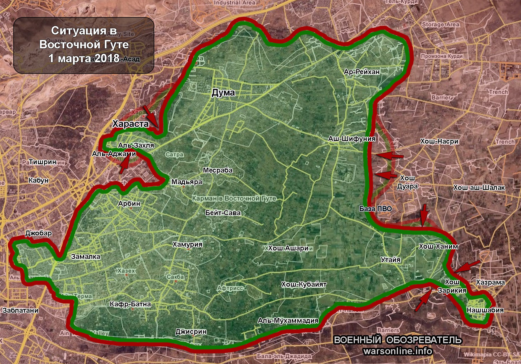 09.15 По сообщениям СМИ, сирийской армии удалось достигнуть новых успехов в ходе операции «Дамасская сталь», проводимой в Восточной Гуте. Сообщается, что подразделению «Тигры» удалось освободить населенный пункт Хош аль-Заркия.