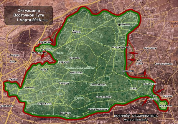Сирия, 2 марта. «Ан-Нусра»* напала на позиции союзников сил САР в северной части Латакии. САА перебрасывает дополнительные части в Восточную Гуту. «Тахрир Аш-Шам» готовится к масштабным столкновениям с «Джебхат Тахрир Сурия» в Алеппо, сообщает военный источник Федерального агентства новостей (ФАН) в Сирии Ахмад Марзук (Ahmad Marzouq).