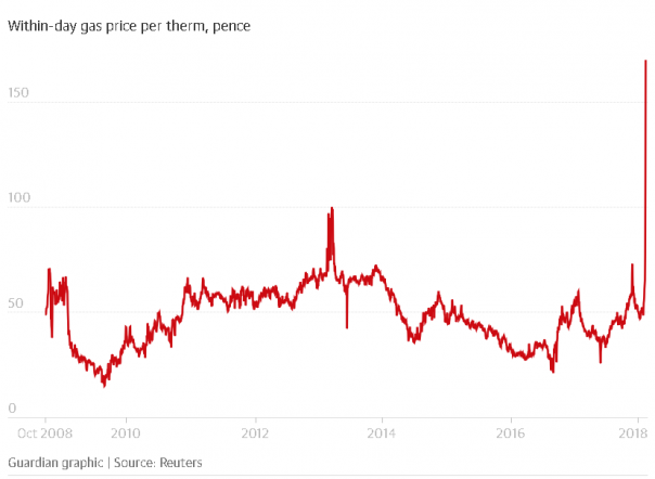 Широко распространенный снег и температура -7.8C из-за « Зверя с Востока» и «Штормовой Эммы» побудили потребителей разгонять их отопление. Органы общественного здравоохранения рекомендуют температуру в помещении 18 ° C.