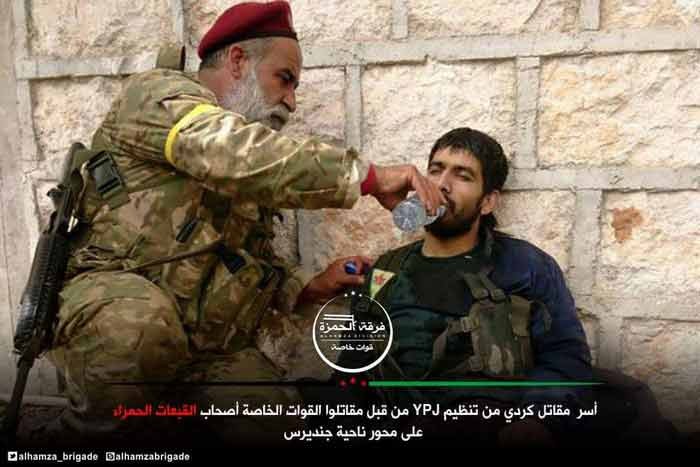 Пленные курды после боев за Шаранли. На первом фото пленного бойца YPG поит боец протурецкой бригады "Соколы курдов"