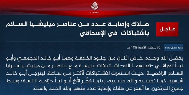 15.34 Боевики запрещенной ИГ захватили в плен группу шиитских ополченцев Хашд-Шааби севернее Багдада.