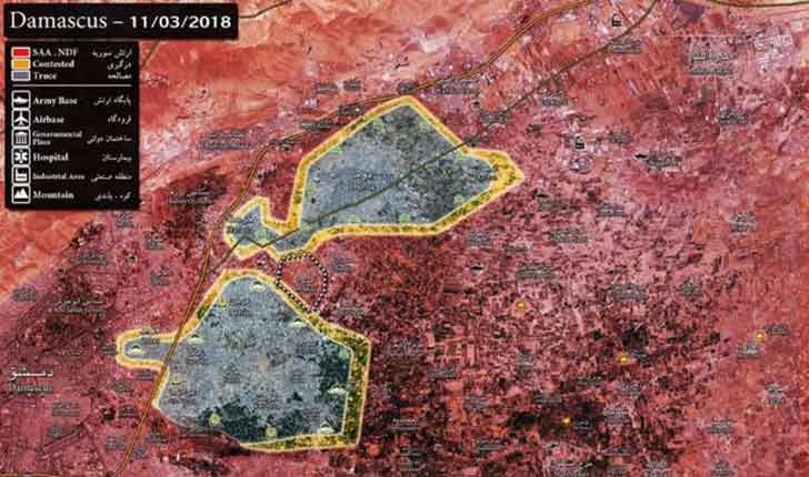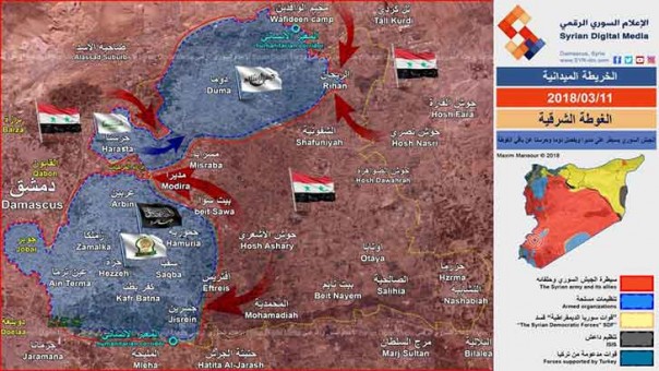 После того, как правительственные войска освободили город Мудайра, мятежный анклав в Восточной Гуте оказался разрезан на две части. Однако, командование ВС САР не остановилось на достигнутых результатах.
