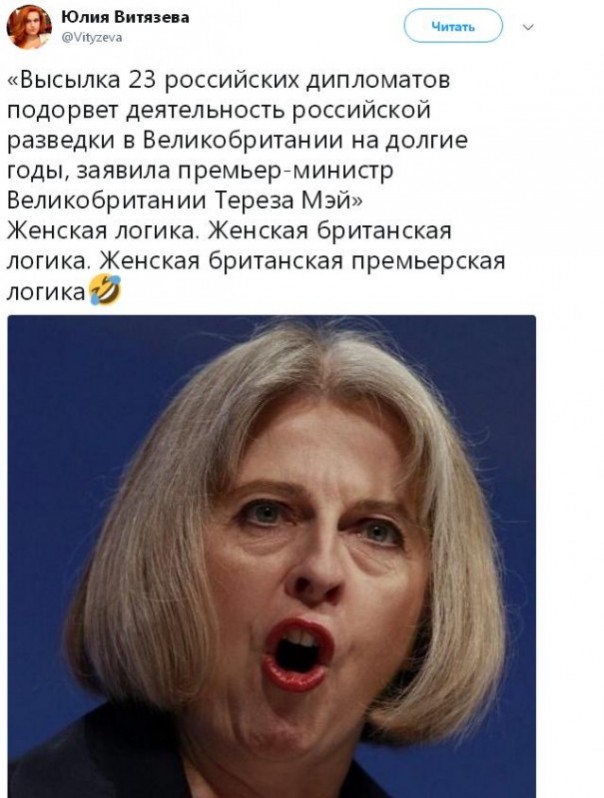 «Заявление премьер-министра Великобритании Т.Мэй в парламенте 14 марта о мерах "наказания" России под фальшивым предлогом о якобы причастности к отравлению С.Скрипаля и его дочери расцениваем как беспрецедентно грубую провокацию, подрывающую основы нормального межгосударственного диалога между нашими странами. Считаем категорически неприемлемым и недостойным тот факт, что правительство Великобритании в своих неблаговидных политических целях пошло на дальнейшее серьезное обострение отношений, объявив о целом наборе враждебных мер, включая высылку из страны 23-х российских дипломатов. Вместо того, чтобы завершить собственное расследование, задействовать установленные международные форматы и инструменты, в том числе в рамках Организации по запрещению химического оружия, к чему мы были готовы, британское правительство сделало выбор в пользу конфронтации с Россией. Очевидно, что пойдя на односторонние и нетранспарентные методы расследования этого инцидента, британские власти в очередной раз попытались развязать огульную антироссийскую кампанию. Разумеется, наши ответные меры не заставят себя ждать», - такова реакция Министерства иностранных дел Российской Федерации.