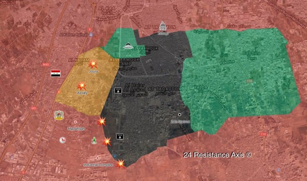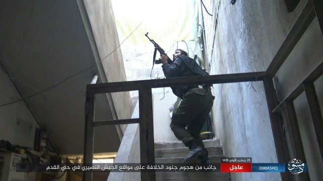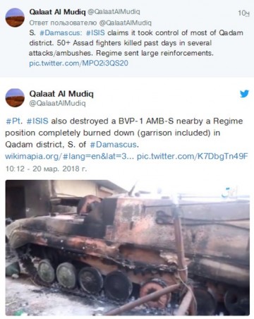 09.00 Боевикам запрещенной в России группировки «Исламское государство» удалось захватить до 30% района аль-Кадам южнее Дамаска. По утверждению самих боевиком, в ходе последних боев в данном районе им удалось убить не менее 40 военнослужащих, проправительственные источники подтверждают данную информацию.