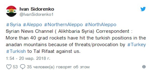 10.35 По сообщениям СМИ, армия Сирии обстреляла позиции протурецких боевиков в провинции Алеппо. Сообщается, что обстрел был произведен из систем залпового огня. Целью сирийских военных стала база турецких войск, создаваемая ими в окрестностях города Анадан, северо-западнее Алеппо.