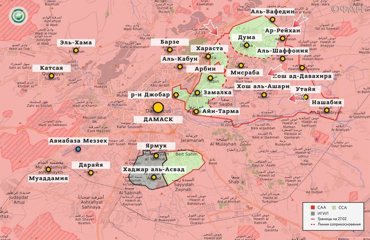 14.45 Сирийская армия и части Республиканской Гвардии вошли на территорию поселка Хазза (Хаззех) в Восточной Гуте. По некоторым данным, военные взяли под контроль от трети до половины территории населенного пункта и продолжают наступление.