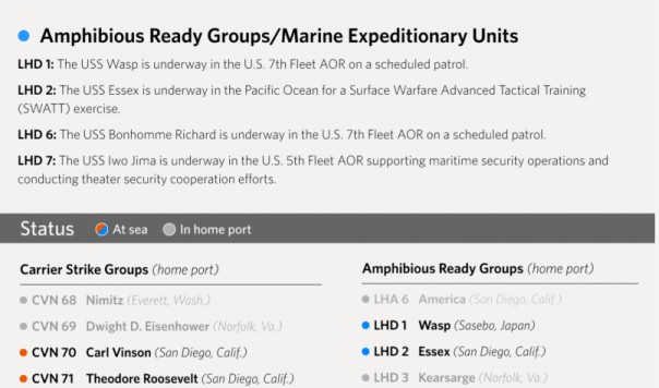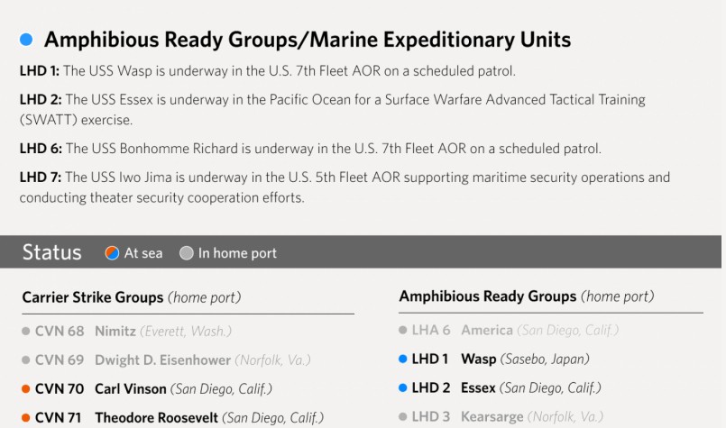 Между тем, каких-либо признаков крупномасштабного стягивания американских боевых ракетных кораблей на позиции для нанесения действительно массированного удара сотнями ракет, пока не наблюдается. Во всяком случае, по официальным данным командования 6-го флота США, оперирующего в Средиземном море, перекрестно подтверждаемым другими открытыми источниками, здесь в настоящий момент находится весьма ограниченное количество американских боевых кораблей – порядка 2 -3 эсминцев УРО (USS Laboon DDG 58, USS Ross (DDG 71, USS Carney DDG-64). Еще несколько ударных боевых единиц того же ранга развернуты в составе 5-го американского флота, оперирующего в Персидском заливе и Красном море, и также могут быть привлечены к участию в ракетном нападении.