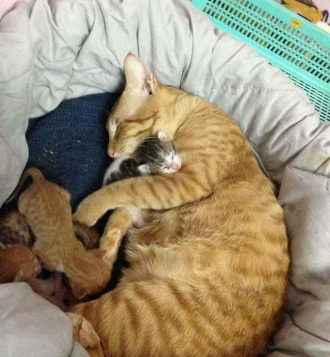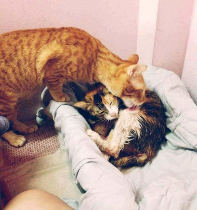 Недавно на Facebook появилась серия трогательных фотографий кота по кличке Yello, поддерживающего маму- кошку во время и после родов.